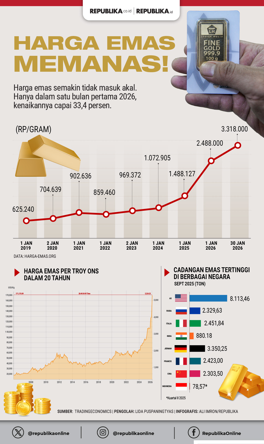Harga referensi (HR) emas juga naik dari 4.960,24 dolar AS per troy ounce (t oz) menjadi 5.025,35 dolar AS per troy ounce. “Kenaikan harga emas didorong oleh meningkatnya permintaan safe-haven serta pembelian oleh sejumlah bank sentral global di tengah meningkatnya tantangan ekonomi dunia,” ujar Tommy dalam keterangan di Jakarta, Sabtu (28/2/2026).