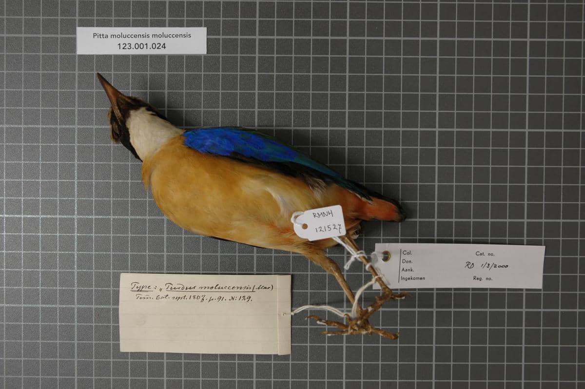 Burung paok sayap biru pertama kali diidentifikasi oleh seorang naturalis Jerman bernama Philipp Ludwig Statius Müller pada tahun 1776. Awalnya, burung ini diberi nama ilmiah Turdus moluccencis. Namun, setelah penelitian lanjutan, nama ilmiahnya direvisi menjadi Pitta moluccensis oleh Louis Jean Pierre Vieillot pada tahun 1816. Burung ini memiliki panjang tubuh antara 18 cm hingga 21 cm, dengan kepala berwarna hitam, dagu berwarna putih, dan bagian bawah berwarna krem. Bagian bahu dan punggungnya berwarna hijau, sedangkan sayapnya berwarna biru cerah. Burung jantan memiliki warna lebih cerah dibandingkan betina.