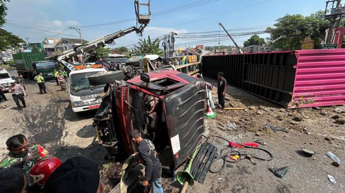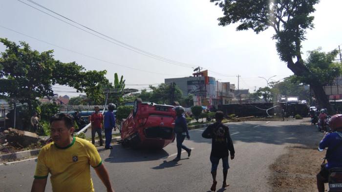 Di lokasi kejadian, tampak puing-puing kendaraan berserakan, tanah berceceran di jalan, serta tiang lampu yang roboh dan merusak fasilitas umum lainnya. Warga sekitar juga terlihat bergotong royong membantu membersihkan material yang mengganggu arus lalu lintas.