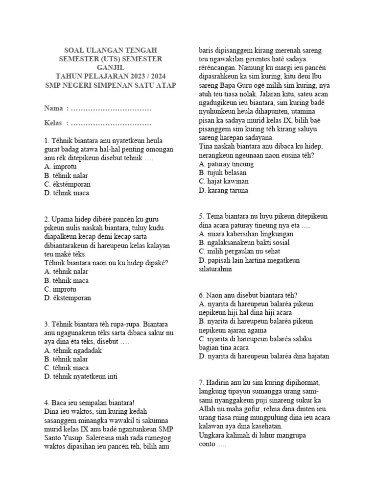 Berikut adalah beberapa contoh soal Bahasa Sunda Kelas 9: