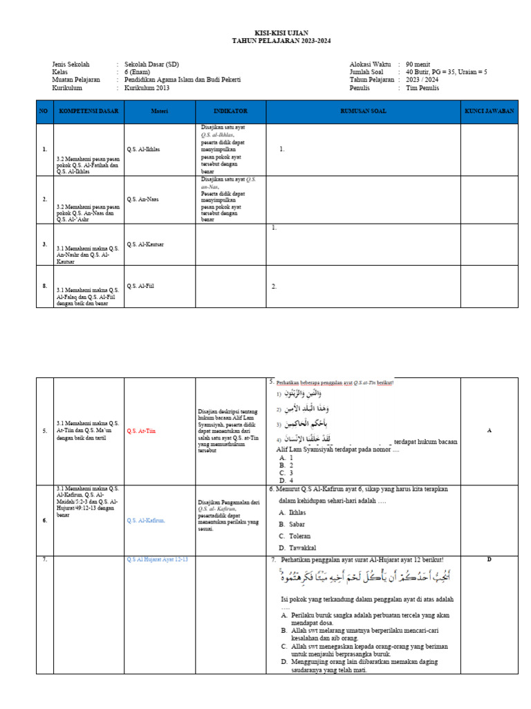 Berikut adalah beberapa contoh soal ujian sekolah PAI kelas 6 SD/MI beserta kunci jawabannya: